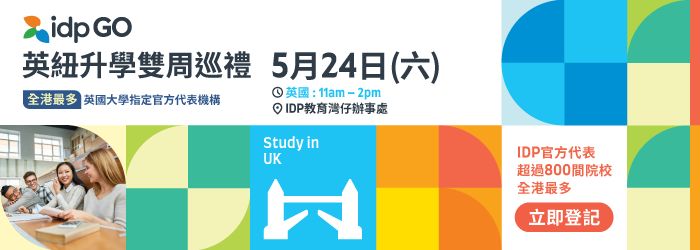 IDP 全年最大型海外升學展,香港中學文憑試 (HKDSE) 放榜後,針對應屆畢業生的需要,特此安排了多間英國及澳洲院校親臨,其中大部份「澳洲八大聯盟」均會參展並為在場學生進行諮詢及面試,同學有機會立即獲知面試結果及獲即場取錄。